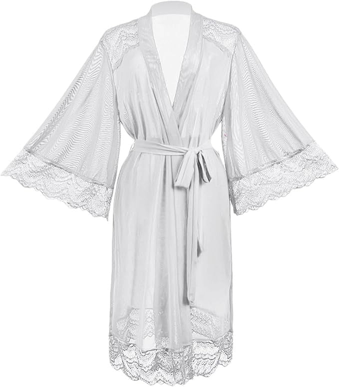 The classic kimono design features an oblique V-neckline and three-quarter sleeves, enhanced with delicate lace trim accents that add a touch of sophistication. The robe comes with a self-tie wrap belt and inner strings to ensure a secure, adjustable fit that flatters every body shape — especially accommodating plus sizes.